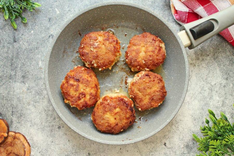 Обжаривайте котлеты с чесноком на среднем огне с двух сторон до готовности и золотистой корочки. Примерно по 4-5 минут с каждой стороны и выделения из них прозрачного сока.