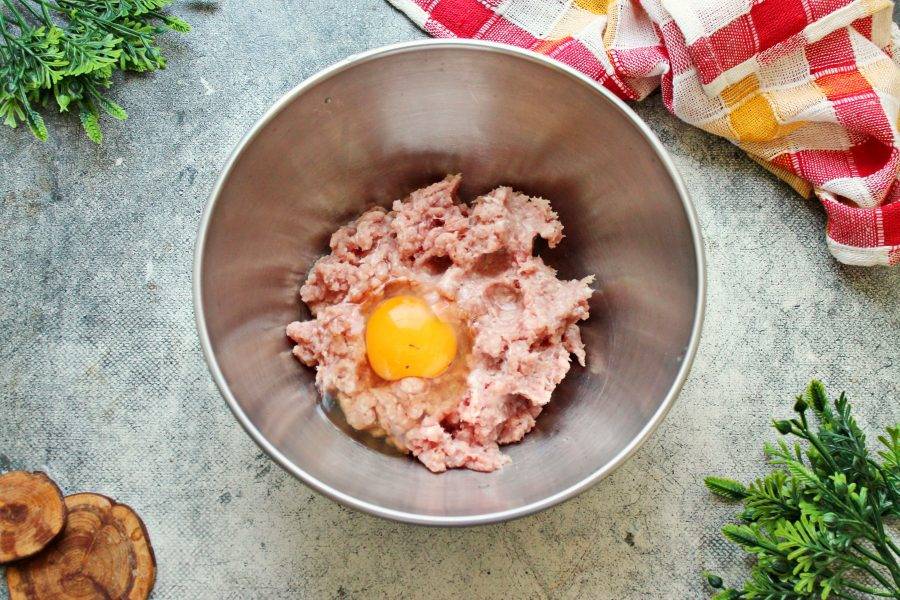 Фарш, у меня свинина и говядина в равных частях, выложите в миску и вбейте яйцо.