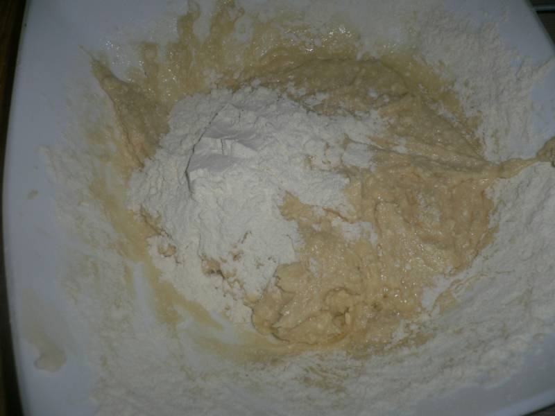 После 5 минутного отдыха добавляем муку и вымешиваем тесто, должно быть оно мягкое.