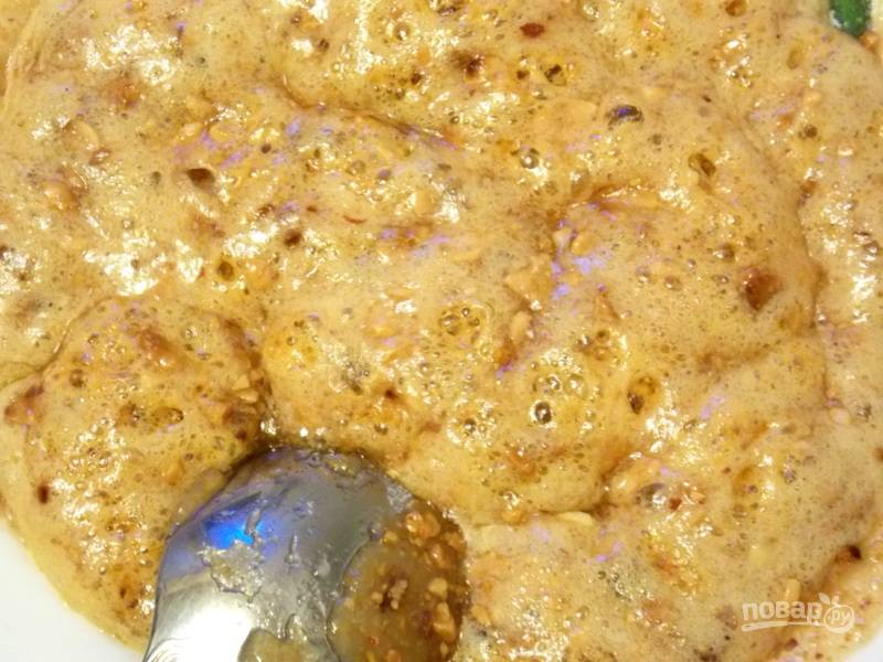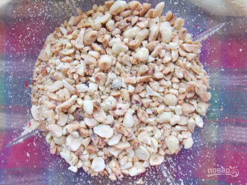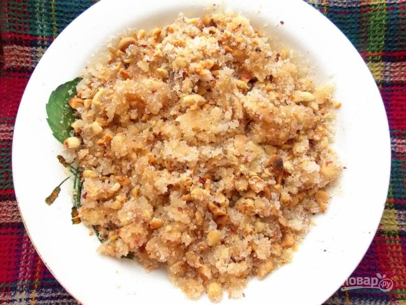 В чашу, пригодную для использования в микроволновой печи, положите молотые орехи, сахар, сироп. Перемешайте.