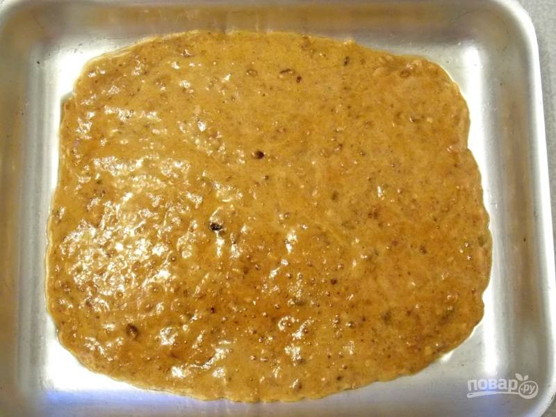 Сразу выливайте в противень, смазанный маслом, и разровняйте.