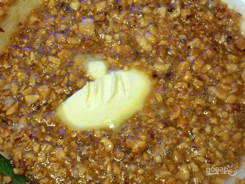 Включайте микроволновую печь при мощности 700 Вт на 6 мин. Смесь должна начать пузыриться, сахар — растаять и приобрести темно-золотистый цвет. Выньте, добавьте масло и ванильный сахар. Перемешайте.