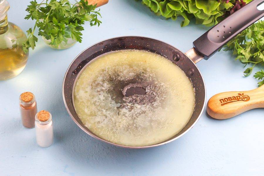 Растопите сливочное масло на сковороде либо в микроволновке.