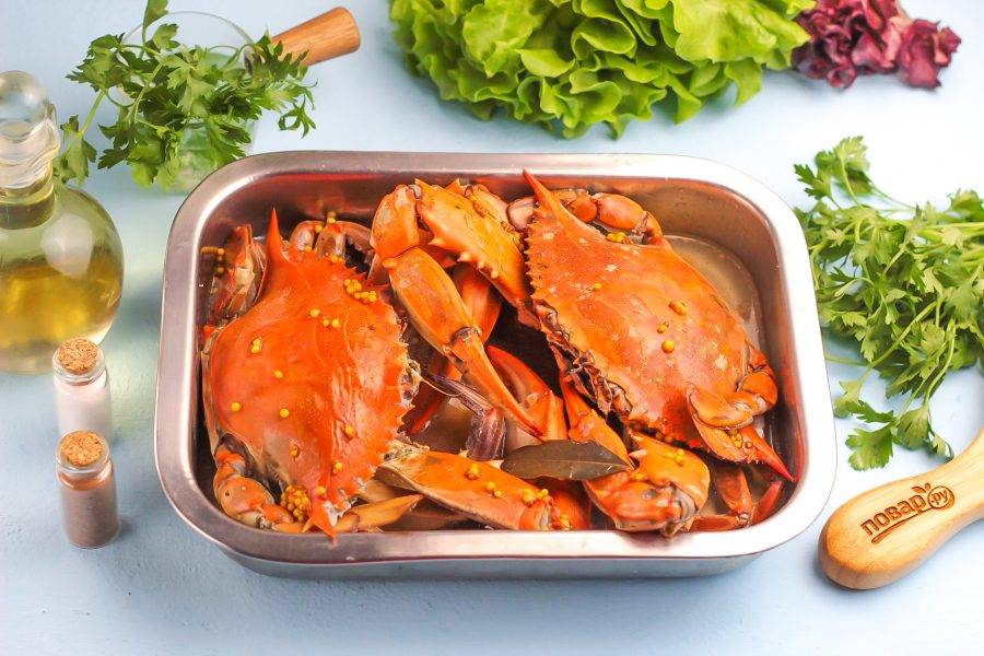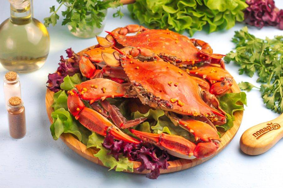 Выложите крабов на доску или блюдо и подайте к столу горячими. Дополните вкусными соусами, салатами и бокалом белого вина. Приятного вам аппетита!