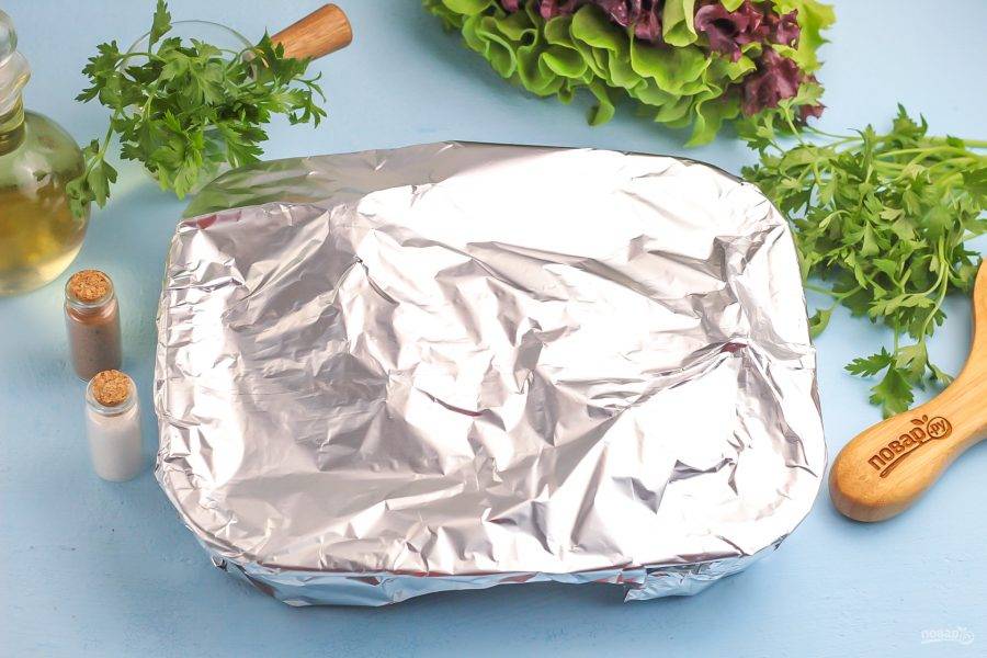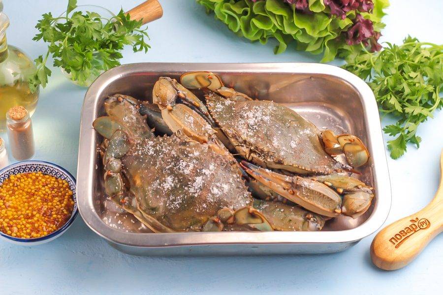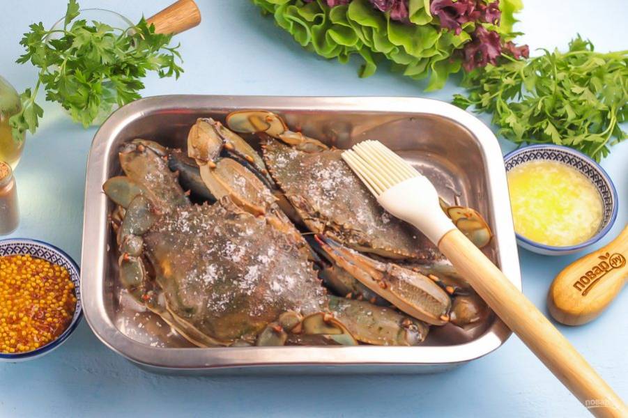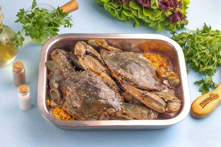 Обязательно накройте форму фольгой, чтобы панцири не подгорели, а крабы отлично пропеклись и внутри. Отправьте форму в духовку на 30-40 минут.