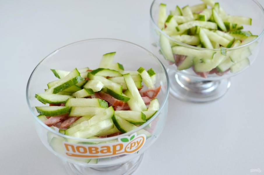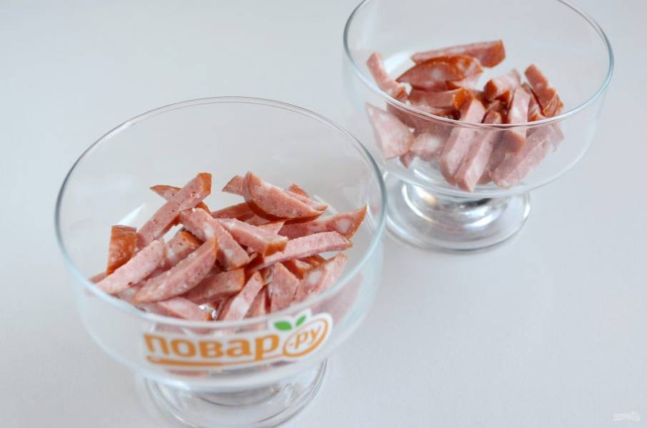2. Колбасу копченую порежьте соломкой, уложите на дно креманок.