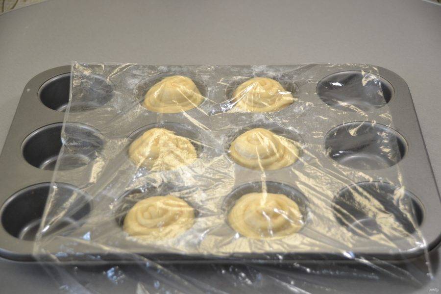 Уложите заготовки краффинов в подготовленную форму для выпечки. Я решила испечь только половину теста, а вторую половину оставить в холоде до следующего завтрака, убрав в пакет. Прикройте краффины плёнкой и оставьте при камнатной температуре для поднятия на 1 час.