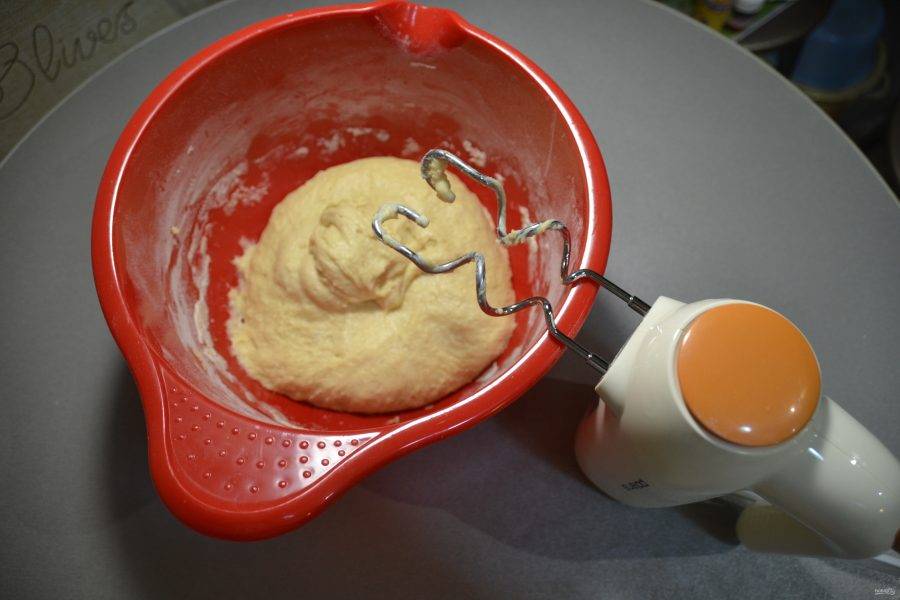 Сначала тесто вымешивайте миксером, затем продолжайте на рабочей поверхности стола руками.