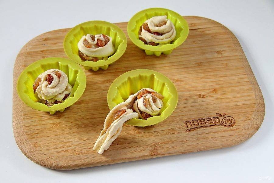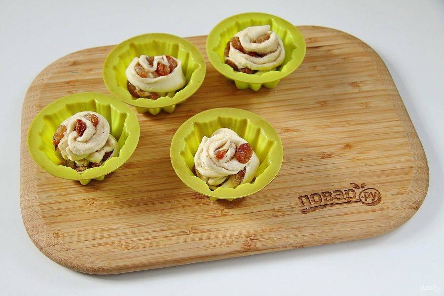 Первую часть рулета разверните срезом наружу и закрутите улиткой. Выложите полученную улитку в формочку для кексов. Вторую часть рулета так же выверните, заверните и уложите сверху на улитку.
