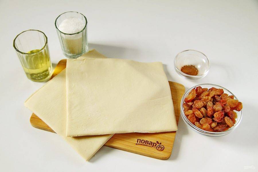 Подготовьте все ингредиенты. Тесто заранее достаньте и разморозьте при комнатной температуре.