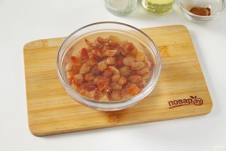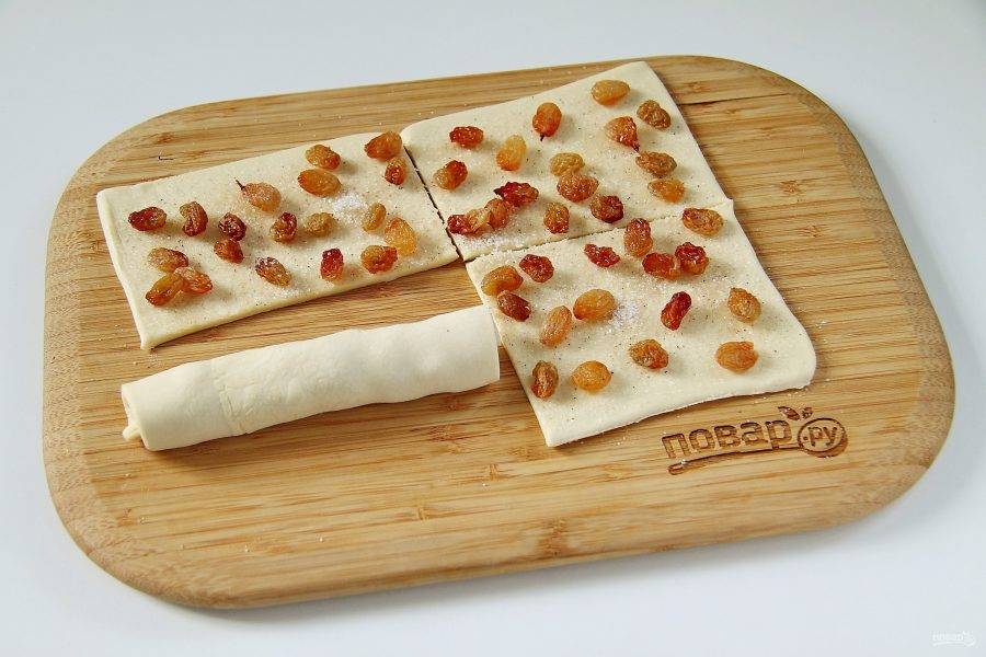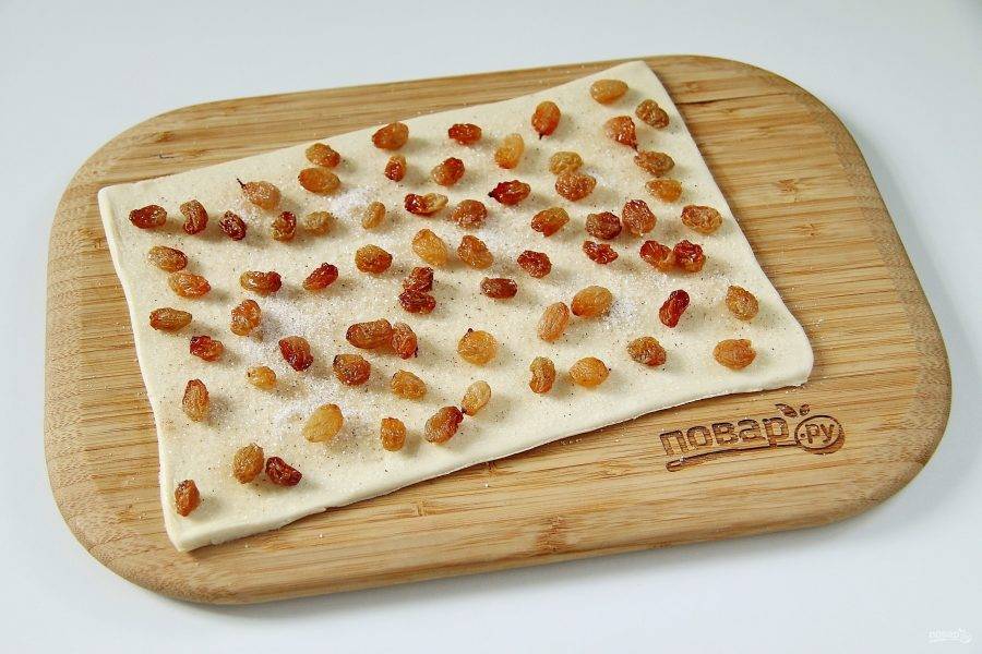 Первый пласт теста раскатайте в форме прямоугольника около 2 мм толщиной. Смажьте поверхность растительным маслом. Соедините сахар с корицей и посыпьте им тесто. Изюм обсушите и разложите сверху.