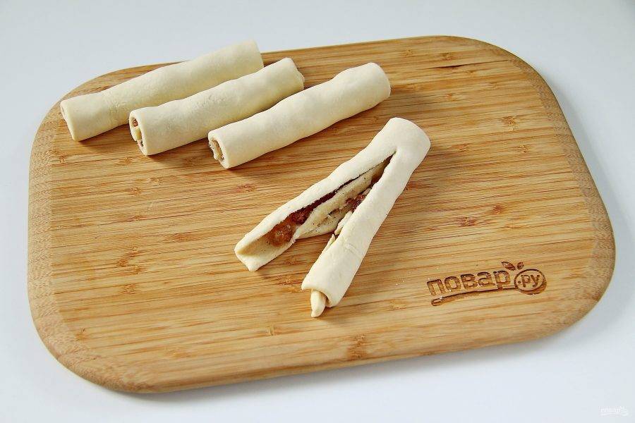 Каждый рулет разрежьте на две части, не дорезая его до конца.