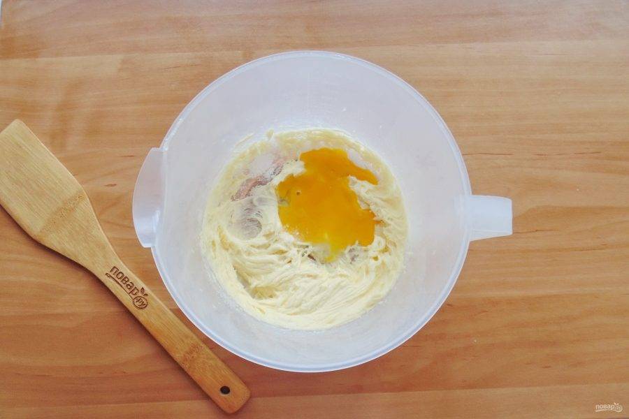 Взбейте миксером масло с сахарной пудрой до пышной пены и добавьте желток и соль. После снова немного взбейте.