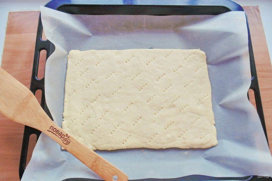 Достаньте тесто из холодильника и раскатайте в пласт толщиной 3-4 мм. Наколите вилкой и отправьте в духовку, разогретую до 175-180 градусов.