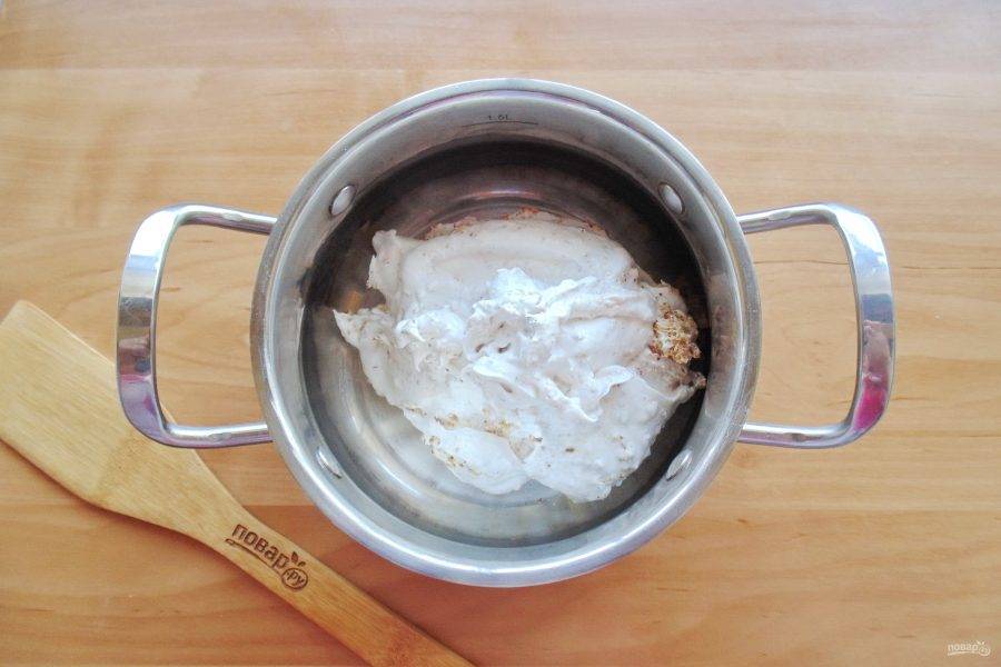 Выложите белки с сахаром и миндалем в кастрюлю и поставьте на плиту.
