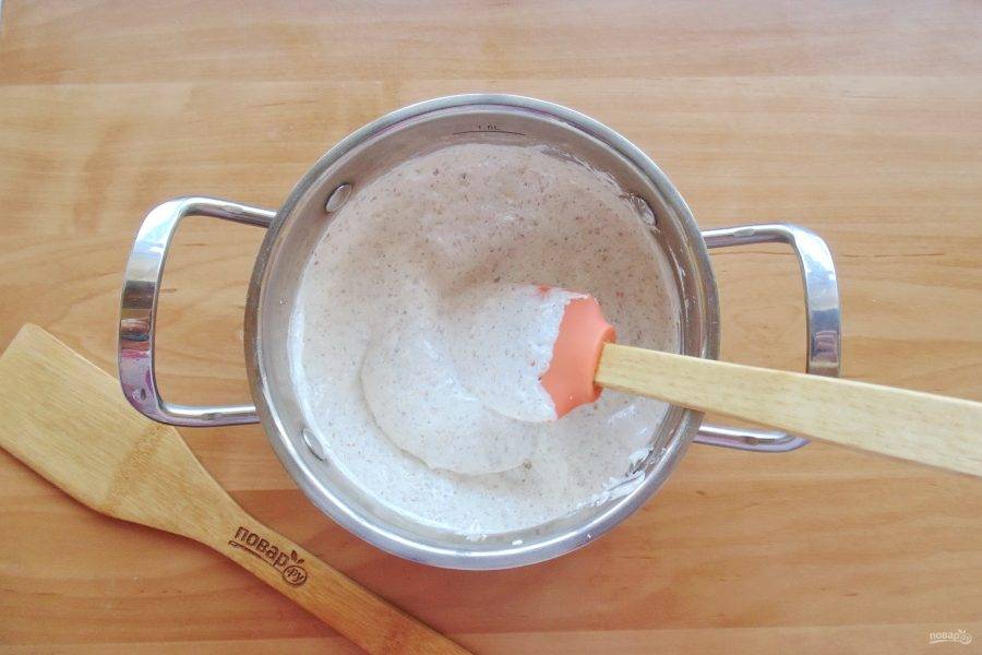 Постоянно перемешивая, хорошо нагрейте массу. На этой уйдет 7-8 минут. Затем немного охладите, добавьте муку и перемешайте.