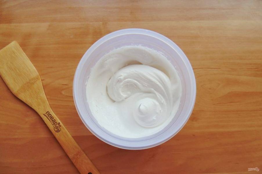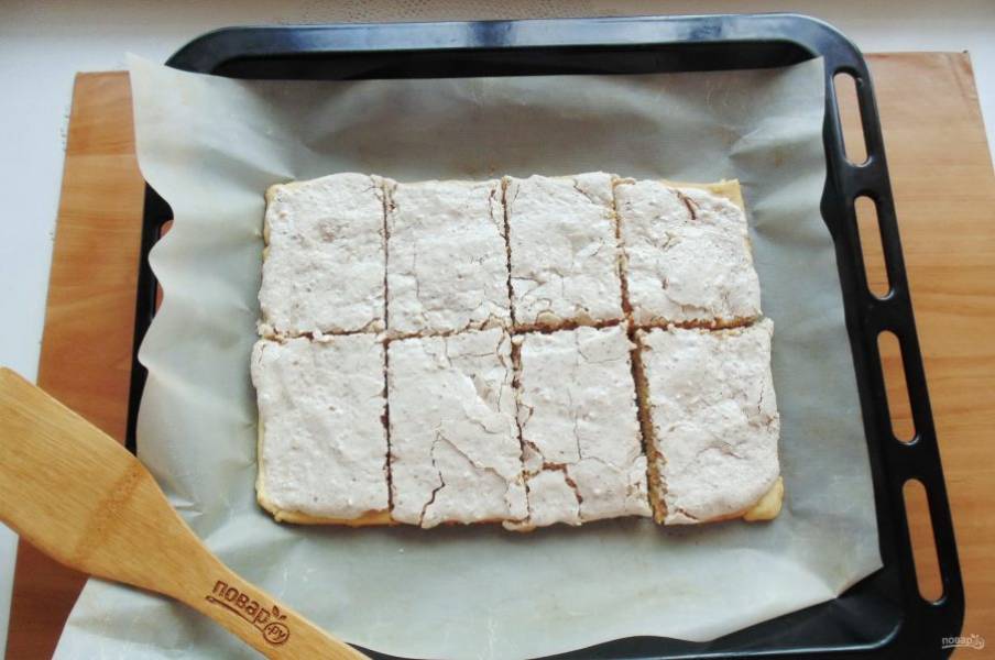 Оставьте корж остывать. В это время приготовьте верхний слой печенья. Взбейте белки с сахаром.