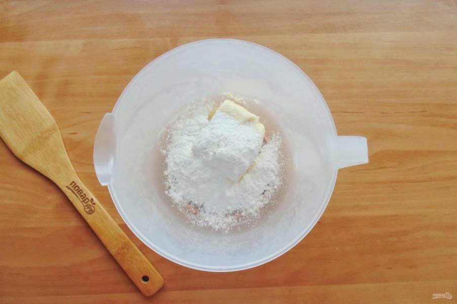 В миску выложите мягкое сливочное масло и сахарную пудру.