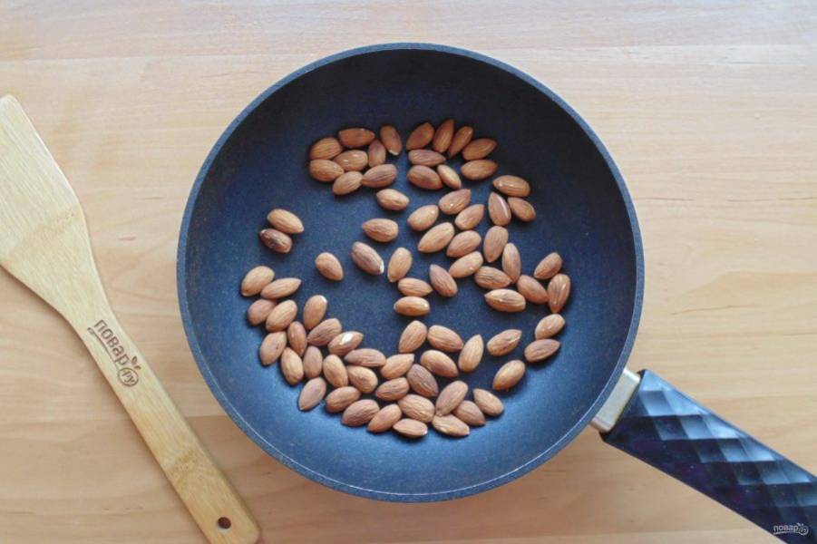 Пока тесто в холодильнике, поджарьте миндаль в сковороде до появления орехового аромата.