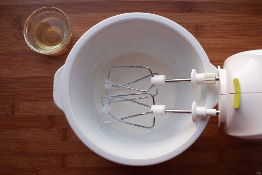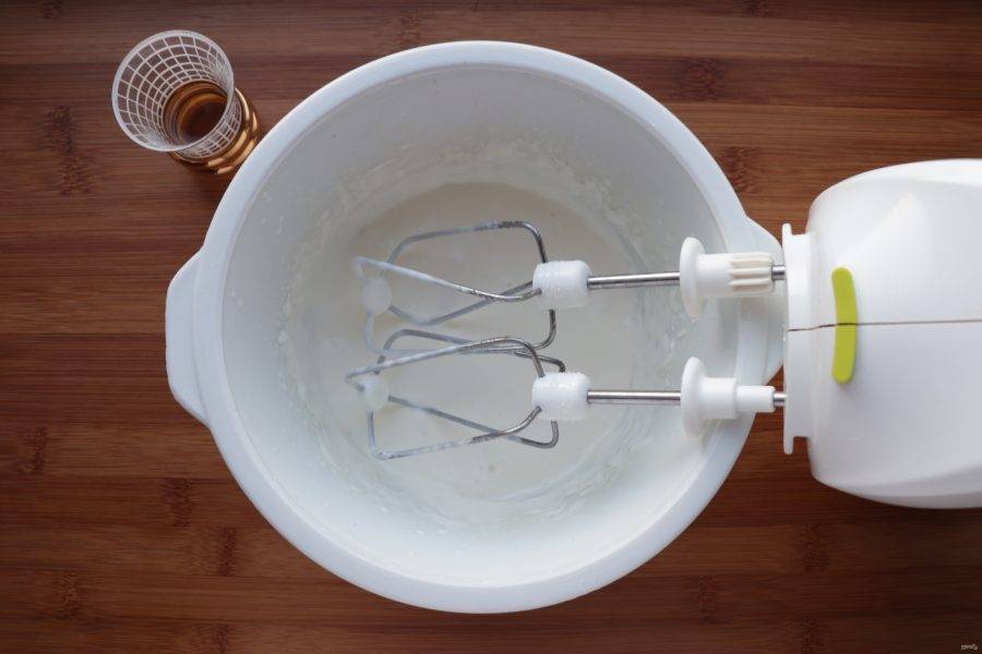 Сливки взбейте, постепенно добавьте мёд.