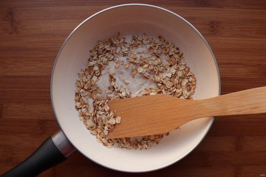 Овсяные хлопья обжарьте на сухой сковороде в течение 2-3 минут непрерывно помешивая.