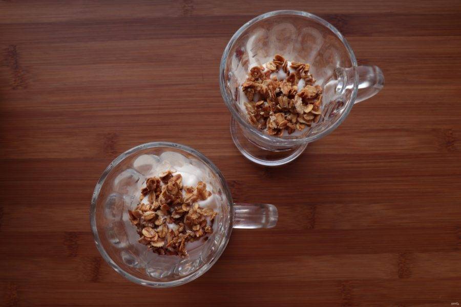 Сливки присыпьте частью овсяных хлопьев.