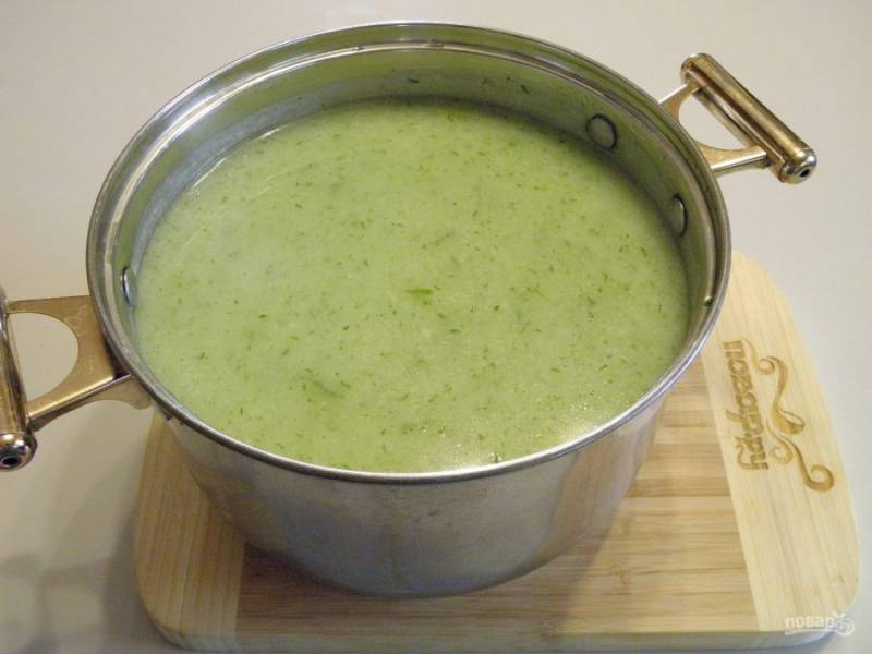 В готовый суп за 2-3 минуты до конца варки добавьте зелень, соль, перец, проварите и выключите огонь. Пюрируйте суп с помощью погружного блендера до однородного состояния.