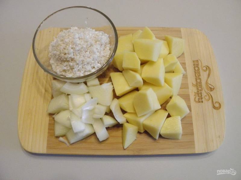 Порежьте крупно лук и картофель, рис промойте до чистой воды.