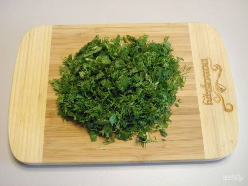 Порежьте всю зелень, размер значения не имеет, ведь суп будет пюрирован после.