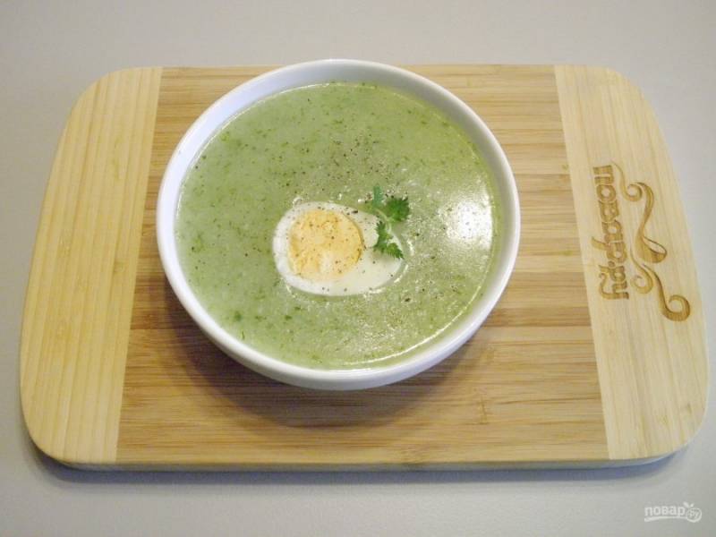 Разлейте суп по тарелочкам, добавьте по половинке яйца, перец черный молотый. Подайте к столу горячим, приятного!