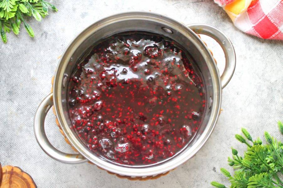 Поставьте кастрюлю с ягодами и сахаром на сильный огонь и доведите до кипения. Варите, мешая, 6-7 минут, а если появится пенка, убирайте.