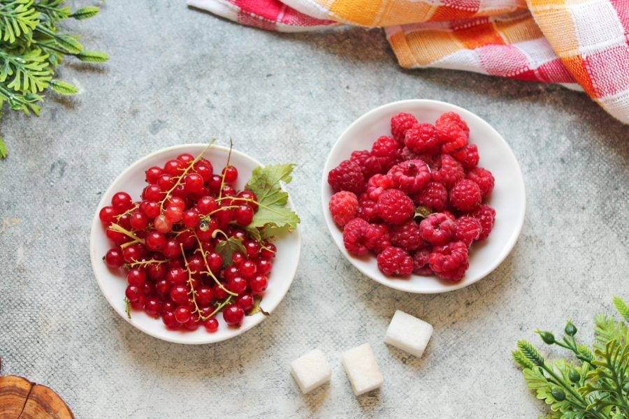 Подготовьте все необходимые ингредиенты для приготовления джема из красной смородины и малины. Малину переберите, удаляя порченые и червивые. Банки тщательно вымойте и простерилизуйте любым удобным способом. Железные крышки кипятите в течение 5 минут на среднем огне. Стерилизованные банки переверните на чистое полотенце, чтобы стекла вода.