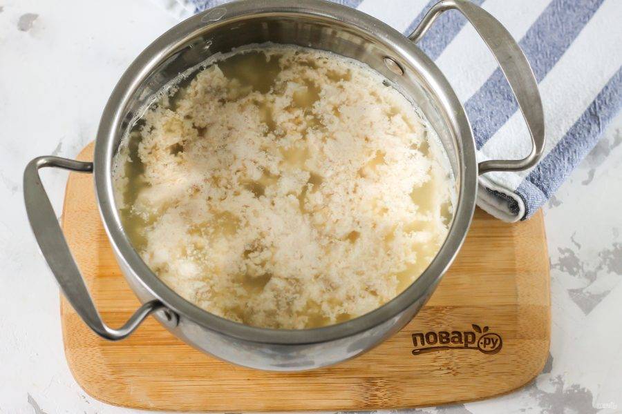 Уменьшите нагрев до умеренного и томите еще 2-3 минуты, содержимое кастрюли должно свернуться. Если этого не произошло, влейте 1 ч.л. лимонного сока и перемешайте.