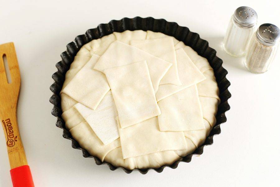 Тесто необходимо разморозить, раскатать и нарезать на полоски. Смажьте форму маслом и выложите полоски теста немного внахлест. Тщательно прижмите места стыков, чтобы сок от начинки в процессе запекания не вытекал.