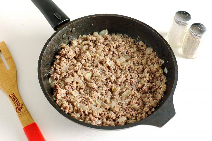 Обжарьте фарш и разбивая комочки лопаткой, жарьте его до тех пор, пока он не побелеет.