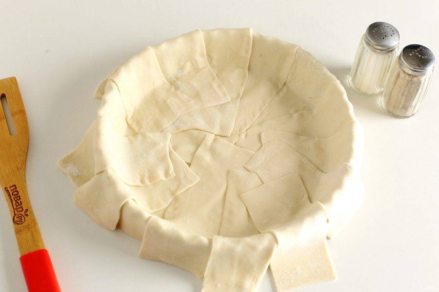 Затем закройте пирог сверху свисающими полосками теста. Посередине выложите тесто, чтобы не было просветов. Слегка прижмите тесто руками.