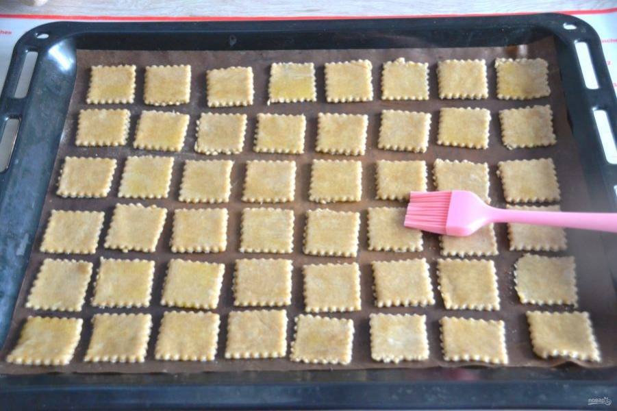 Выложите крекеры на лист для выпечки, смажьте подготовленной эмульсией.