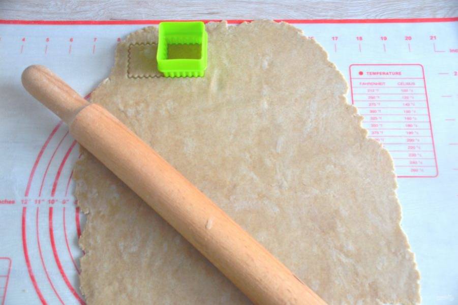 Раскатайте тесто в пласт толщиной примерно 3 мм. Формочкой или специальным фигурным ножом нарежьте в произвольной форме крекеры.