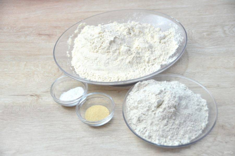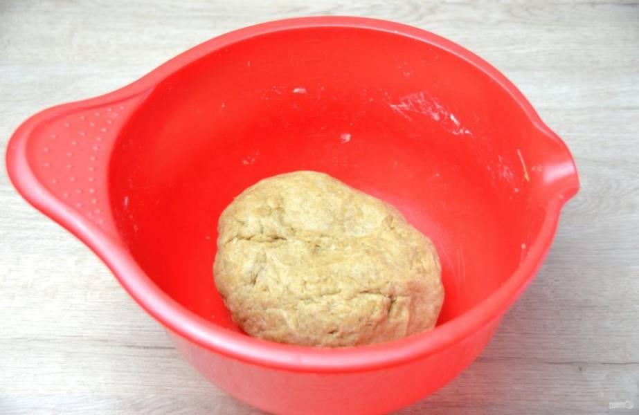 Всыпьте смесь сухих ингредиентов в миску, замесите тесто. В зависимости от влажности муки может потребоваться дополнительное количество воды, примерно 30 мл. Тесто должно быть плотным, но эластичным. Накройте тесто пленкой, поставьте в теплое место для брожения на 2 часа.