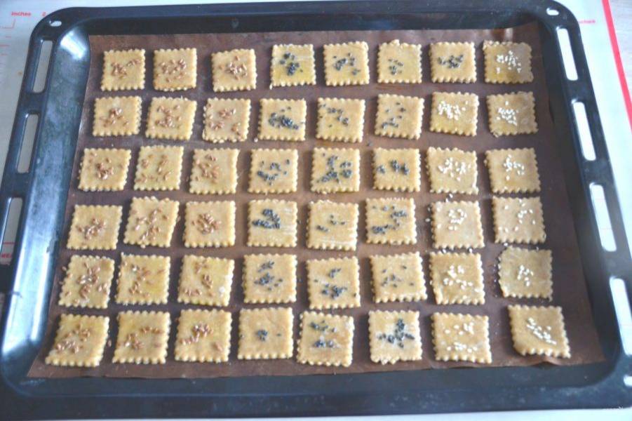 Присыпьте крекеры кунжутом, семенами льна или сухими пряными травами. Выпекайте в духовке при температуре 200 градусов 12 минут. Пока выпекается первая партия крекеров, займитесь приготовлением следующей партии.