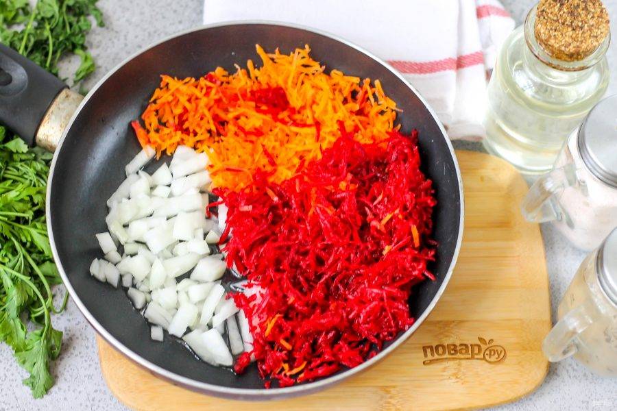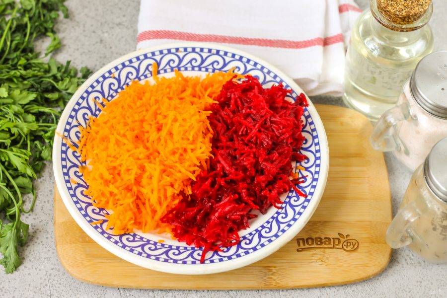 На терке с мелкими ячейками натрите морковь и свеклу. Лук нарежьте мелкими кубиками.
