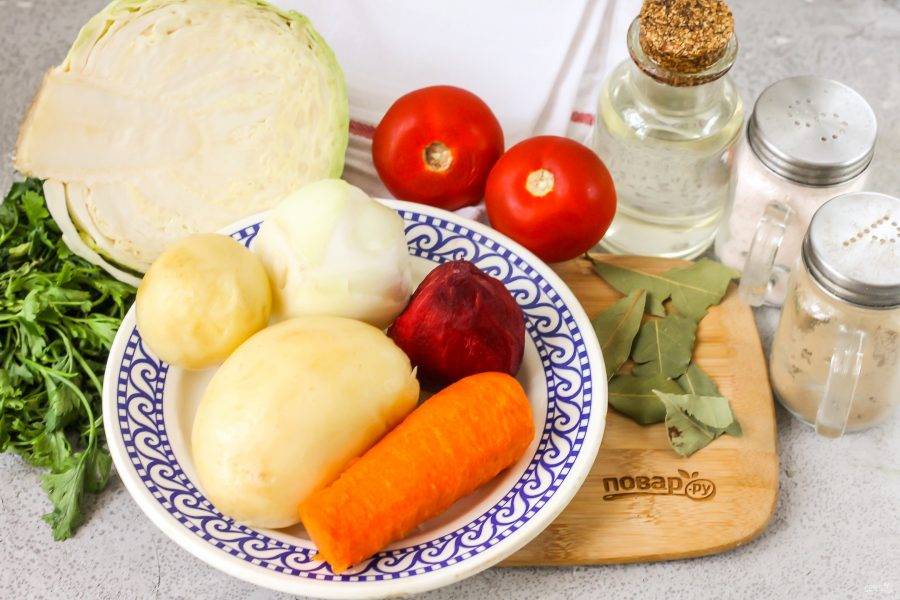Подготовьте указанные ингредиенты. При приготовлении такого блюда много воды не добавляйте, иначе потом получите не крем-борщ, а жидкий борщ.