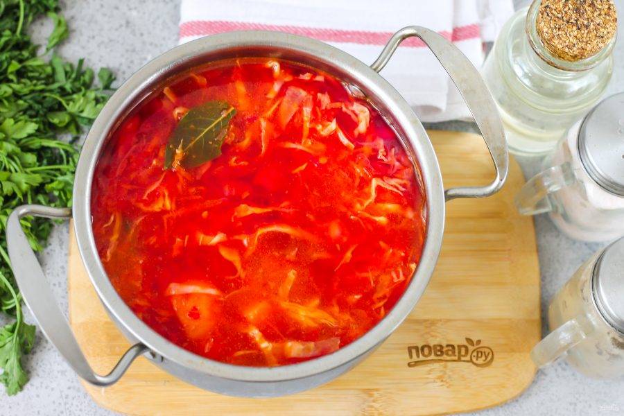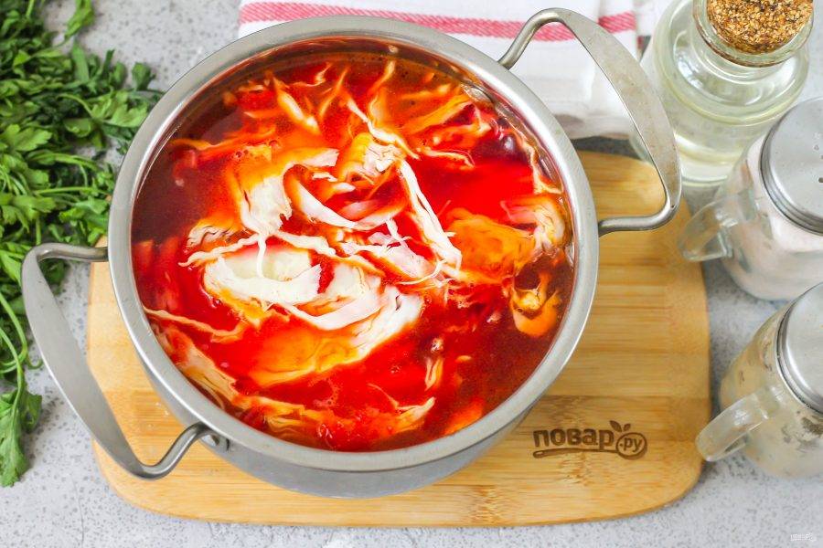 Нашинкуйте белокочанную капусту и добавьте ее в емкость вместе с уксусом, он будет препятствовать обесцвечиванию борща. Томите примерно 3-4 минуты до мягкости капустной нарезки.
