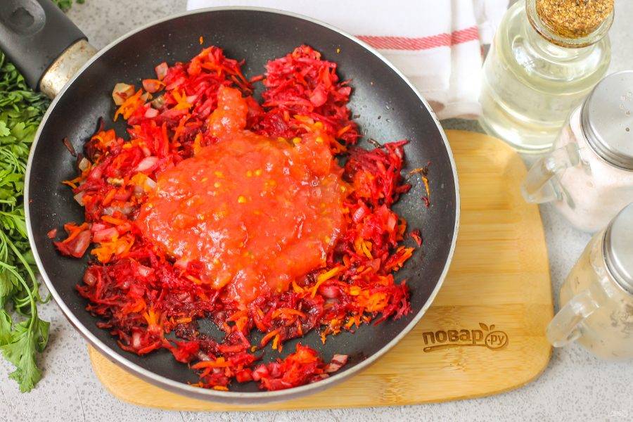 Промойте и разрежьте пополам помидоры, срежьте зеленые черенки и натрите на терке прямо на сковороду, удаляя кожуру. Потушите зажарку еще 2 минуты.
