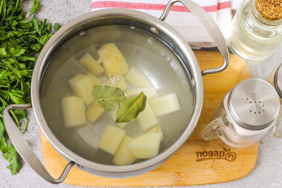 Очистите от кожуры корнеплоды и промойте их все в воде. Картофель нарежьте небольшими кубиками и выложите нарезку в кастрюлю. Влейте горячую воду, добавьте лавровые листья и отварите в течение 15 минут.