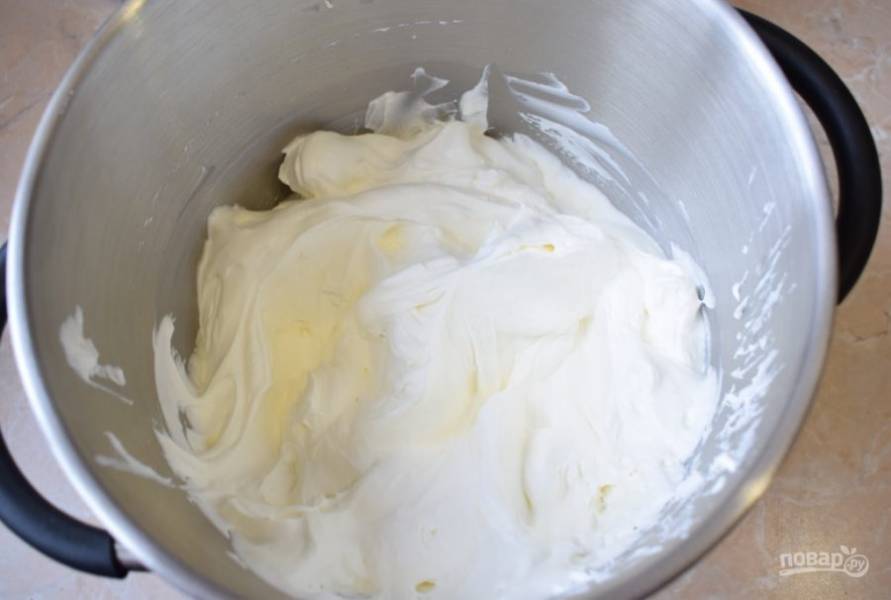 Добавьте к сливкам творожный, сливочный сыр и хорошо его вмешайте в крем, чтобы не оставалось комочков.