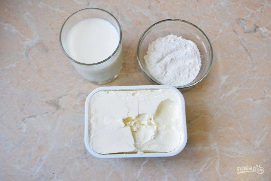 Для приготовления крема подготовьте все ингредиенты. Сливки должны быть хорошо охлажденные. Творожному сыру лучше всего немного дать постоять при комнатной температуре. Так он лучше вмешается в крем.