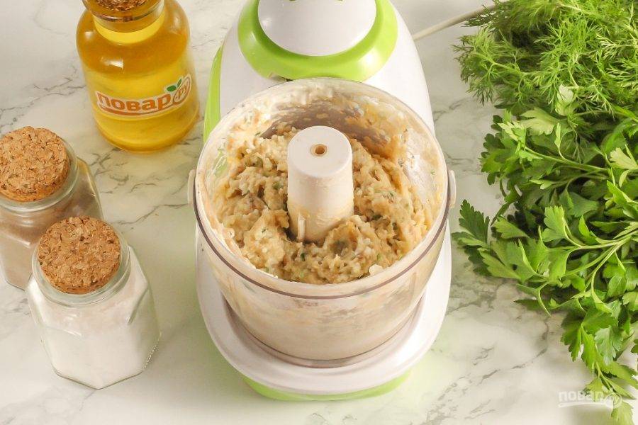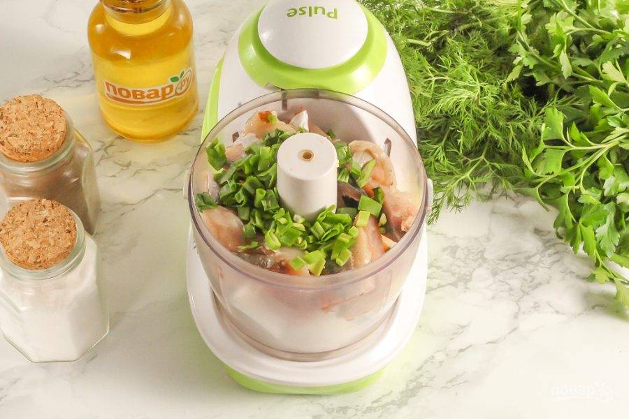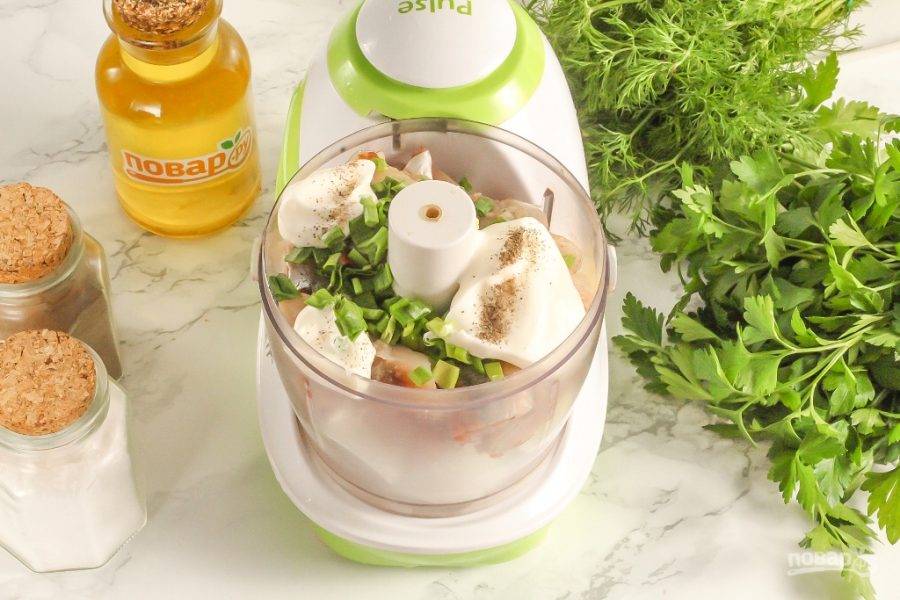 Разрежьте отварные яйца на несколько частей, промойте и измельчите зеленый лук. Выложите все нарезки, включая и рыбную, в чашу измельчителя.