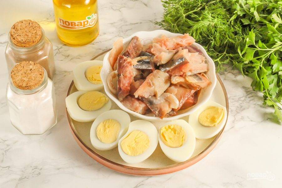 Разрежьте тушку рыбы по хребту на две части, удалите хребет и кости. Срежьте мякоть с кожи. Очистите отварные куриные яйца и промойте их.