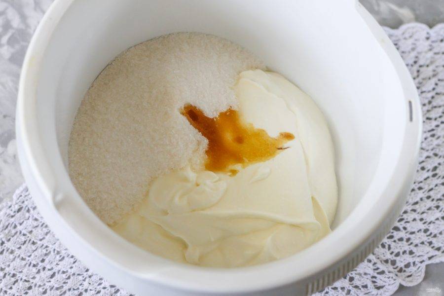 Выложите сметану в чашу кухонного комбайна или в глубокую емкость. Добавьте сахарный песок и ванильный ароматизатор.
